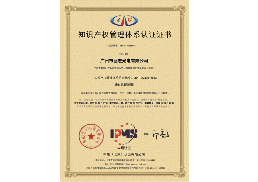 Warmly celebrate "Guangzhou juhong optoelectronics co., ltd." through the "Intellectual property management system certification" of GuanBiao(GB)!
